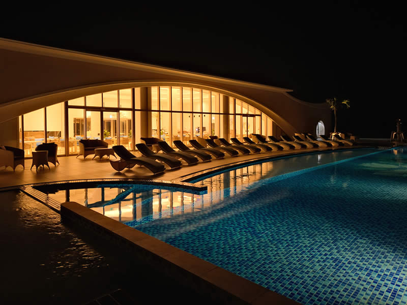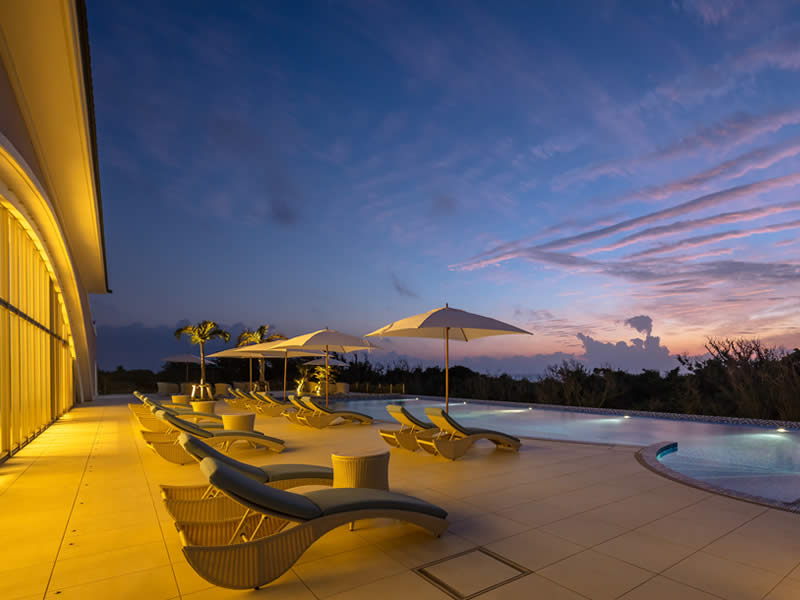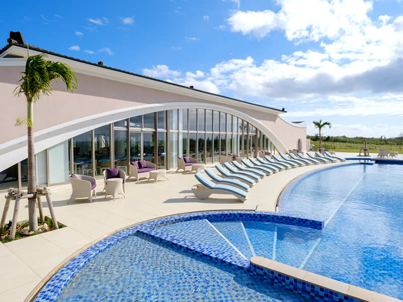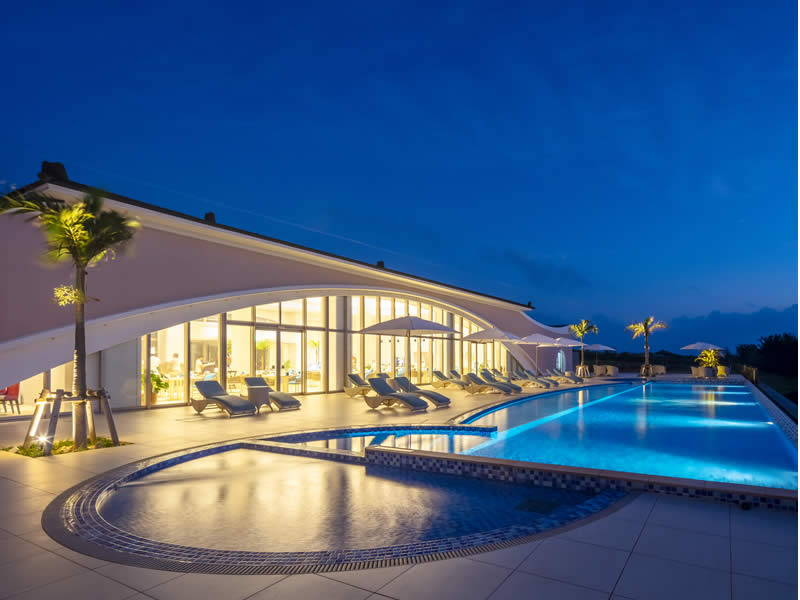 長間浜側のビーチハウス(レストラン)テラスの 東シナ海に沈み行く夕日を眺めながら Seawood Pool 全長25m深さ1.2mの本格的な水泳から、ゆっくりとプカプカできる深さ45cmのお子様用スペースもある、空間ならぬ水間をご体感ください。 メインプール MAIN POOL